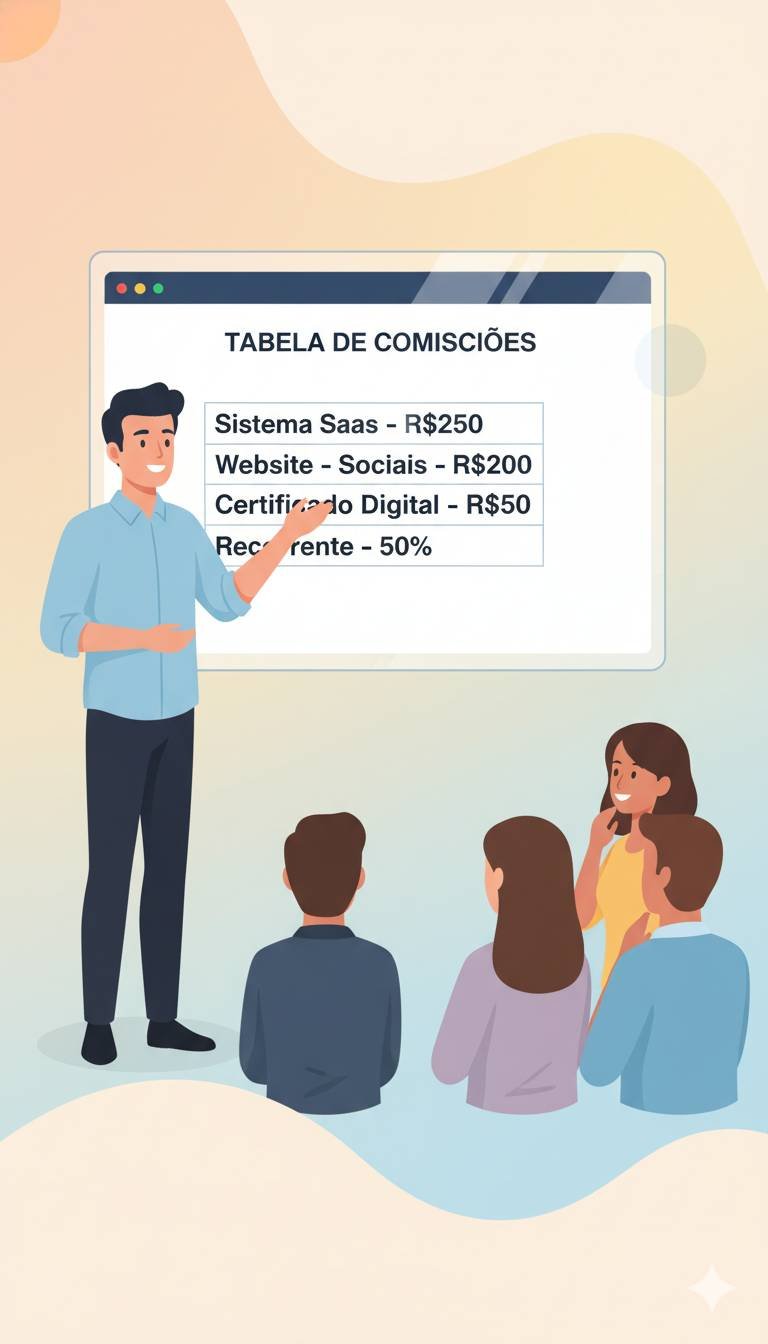 Ganhe até 50% de comissão recorrente — válida somente para clientes que fecharem contrato mensal de manutenção. Para serviços avulsos, a comissão é única. Solicite a tabela completa com Marcos Paiva.